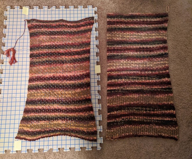 - Lay your project on your blocking surface and pin into desired shape and size. You can push the pins directly into your project and the foam mats. I love how my blocking mats have a grid on them; I use this to make sure my pieces match in size, such a sleeves for a pullover or pieces of a poncho like in the image below. Notice how different in size the two pieces are below!