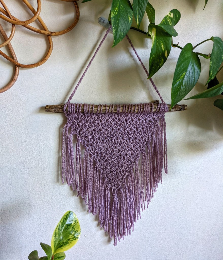 For the purple wall hanging, I followed Janet Pippin’s Western Style Wall Hanging pattern. This pattern starts at the smallest point of the triangle and gradually increases to your desired size width. I have to say this project was initially so challenging for me; I frogged and restarted at least five times before I finally understood the pattern. There were built-in “tassel mounts,” as I like to call them, that protruded from the end of each row. When there were only a few stitches initially, these tassel mounts seemed wrong, and felt uneven. Eventually I decided to trust the process and just go for it despite how weird things looked to me at first, and sure enough, it clicked and I was so happy with the result. I did a simple steam block for this western style wall hanging to help straighten out the tassels and shape the fabric into the look I wanted. I am so happy with this!